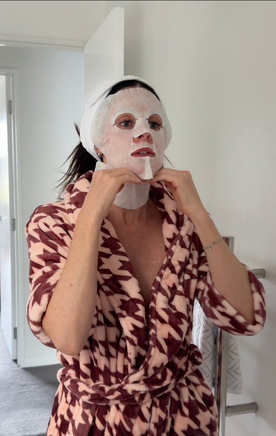 Place the sheet mask carefully over the gel, smoothing it down so it sits comfortably across the contours of your face and neck. This allows the gel to infuse deeply.
